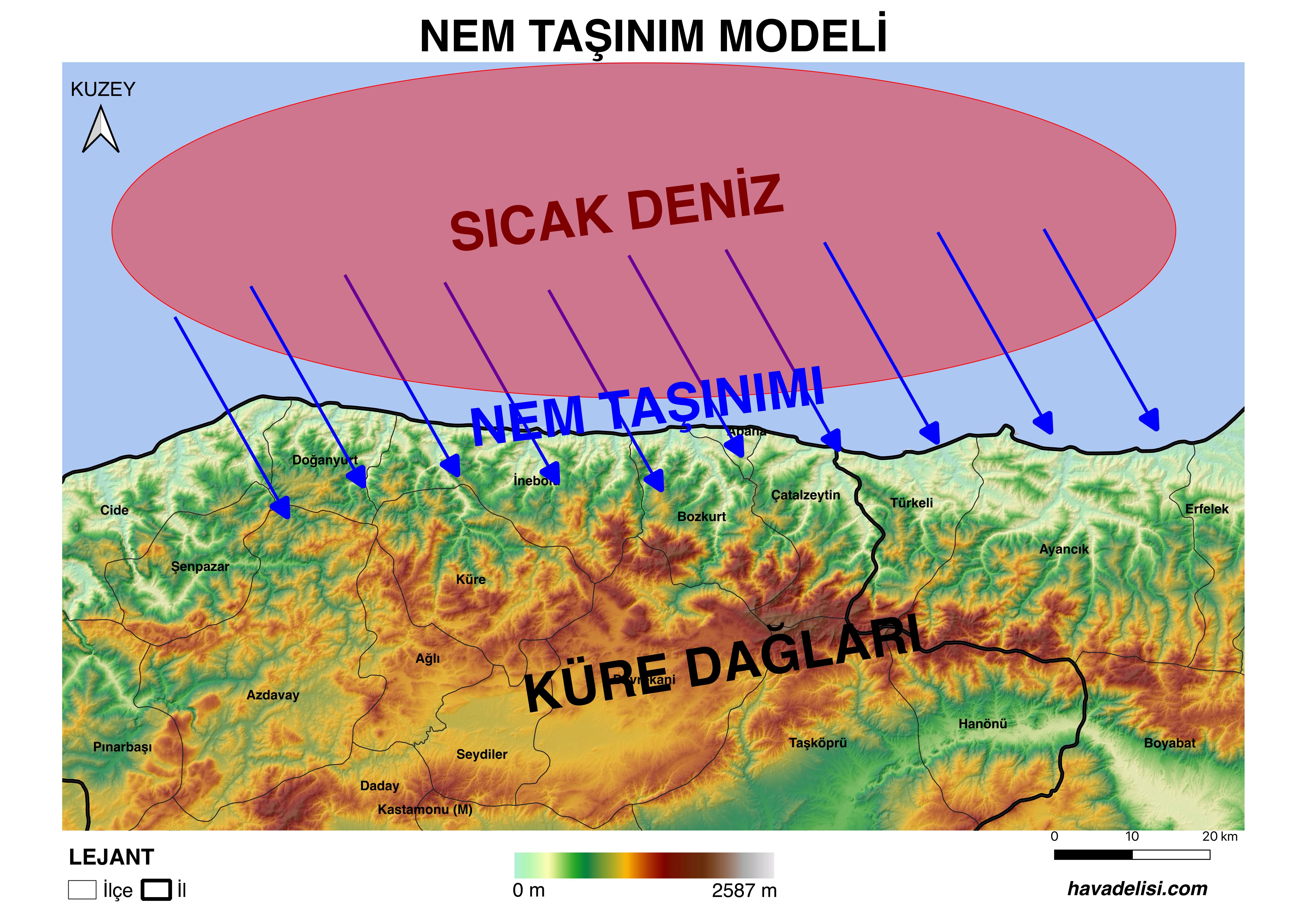 7 Ağustos 2021 tarihinden itibaren etkili olan ve 11 Ağustos’ta büyük yıkımlara yol açan sistemin hemen öncesinde Orta Karadeniz açıklarında deniz yüzeyindeki su sıcaklığının 28-29 derecelere ulaştığı görülüyor. Kuzeyden gelen serin rüzgar, deniz yüzeyinden kalkan su buharını Bozkurt’un hemen ardındaki dağlara taşıyor ve atmosferin üst katmanındaki soğuk havayla karşılaşan nemli hava, bu dağlara bardaktan boşanırcasına yağış indirmeye başlıyor.