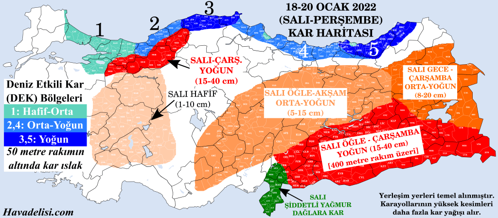 Özellikle Düzce-Sinop arasındaki sahil kesiminde kar sağanakları zaman zaman kuvvetli olacak. Haritada 2. bölge olarak gösterdiğimiz kesimde Çarşamba gecesi, 3. bölgede ise Perşembe sabahına kadar etkili kar sağanakları devam edecektir. Sıcaklık sahillerde kritik olacağından gün içinde yağış ara verdiğinde erime kaçınılmaz; dolayısıyla deniz etkili kütlelerin rotası ve sürekliliğine bağlı olarak kar kalınlığında yerel farklılıklar olacaktır. Kütlelerin ısrarla denk geldiği yerlerde, alçak rakımlarda dahi Perşembe sabahına kadar 2.bölgede 15 cm, 3. bölgede ise 20 cm’ye kadar birikim potansiyeli mevcut ancak sağanakların uzun aralar verdiği yerlerde, deniz seviyesinde -erimeden dolayı- hiç kar birikimi olmayabilir bile. 100 metre rakıma çıkıldığında daha istikrarlı bir kar birIkimi olacaktır, orografik yükselme etkisiyle yükseklerde kar kalınlığı değerlerinin ucu açık.