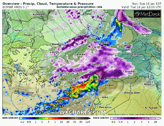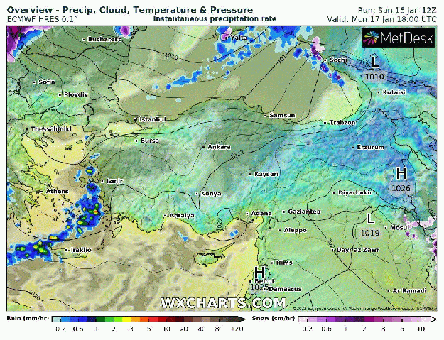 Pazartesi gecesi Muğla açıklarında oluşacak siklon, ilk etapta Güney Ege kıyılarında sağanak yağışlara yol açıyor. Sonrasında Göller Yöresi ve Konya-Karaman çevrelerinde görülecek hafif kar yağışları, siklonun doğuya doğru hareket etmesiyle Salı akşam saatlerinde -daha etkili olarak- Kayseri-Sivas çevrelerinde de görülecek. Kar, bu bölgede güneydoğudaki kadar etkili olmasa da kuvvetli buzlanmayla beraber günlük hayatı olumsuz etkileyecektir.