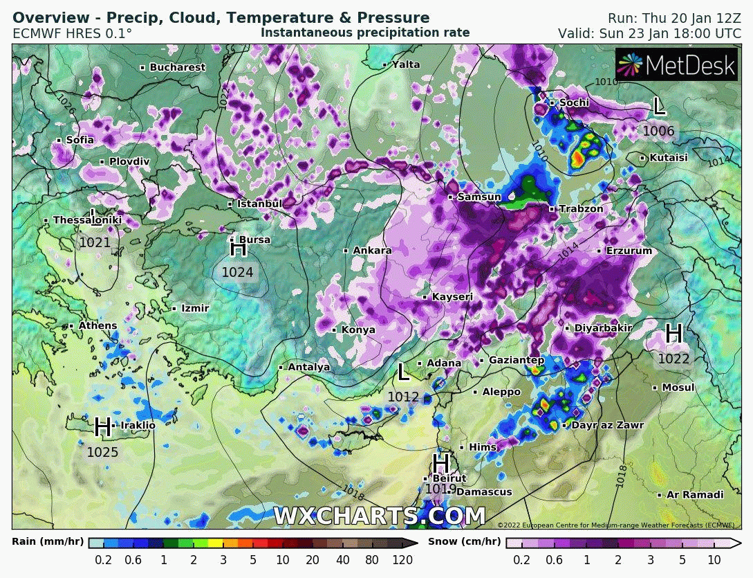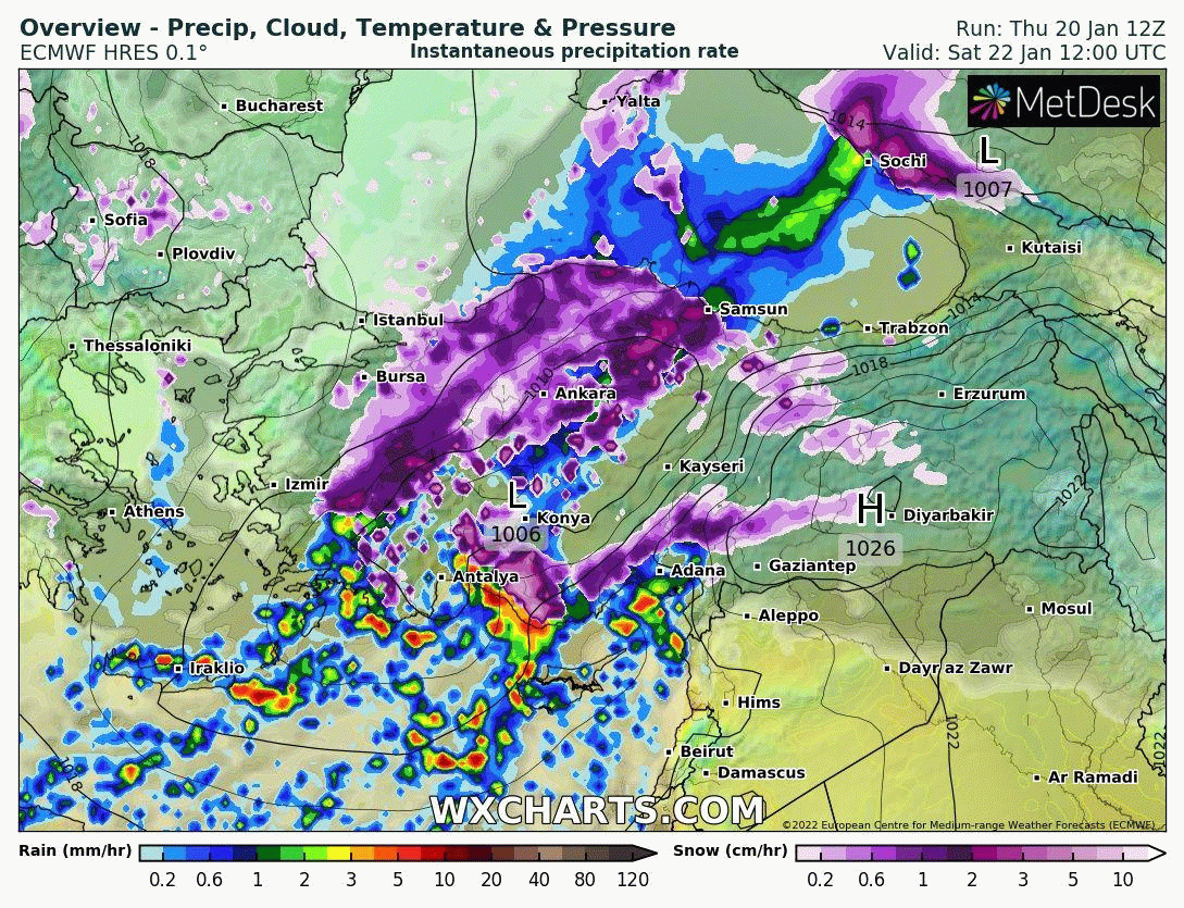 Yine bu esnada (Pazartesi) Ege Denizi üzerinde oluşacak ikincil bir alçak basınç merkezi, Marmara’da -henüz belirsiz olan bir yerlere- sistemin en güçlü kar yağışlarını bırakırken, güneydoğuya doğru kıvrılarak Ege ve Akdeniz kıyı şeridi boyunca da karla karışık yağmur ve kar yağışları oluşturabilecek!