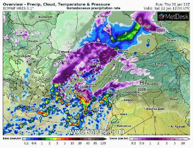 Yine bu esnada (Pazartesi) Ege Denizi üzerinde oluşacak ikincil bir alçak basınç merkezi, Marmara’da -henüz belirsiz olan bir yerlere- sistemin en güçlü kar yağışlarını bırakırken, güneydoğuya doğru kıvrılarak Ege ve Akdeniz kıyı şeridi boyunca da karla karışık yağmur ve kar yağışları oluşturabilecek!