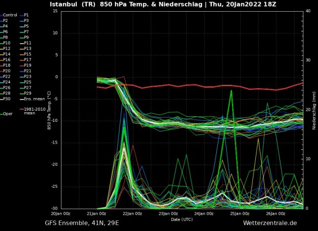 24 Ocak Pazartesi günü her şeyin başlayacağı gün olarak radar ve uydu görüntülerinden anlaşılıyordu ama modeller -özellikle ECMWF- vorteksin aşağıya doğru inişinde boğazı ortalayarak ineceği, devamında da sıcaklıkların poyrazla birlikte hızlıca 2-3 dereceye çıkacağını öngörüyordu. Öyle olmadı 🙂