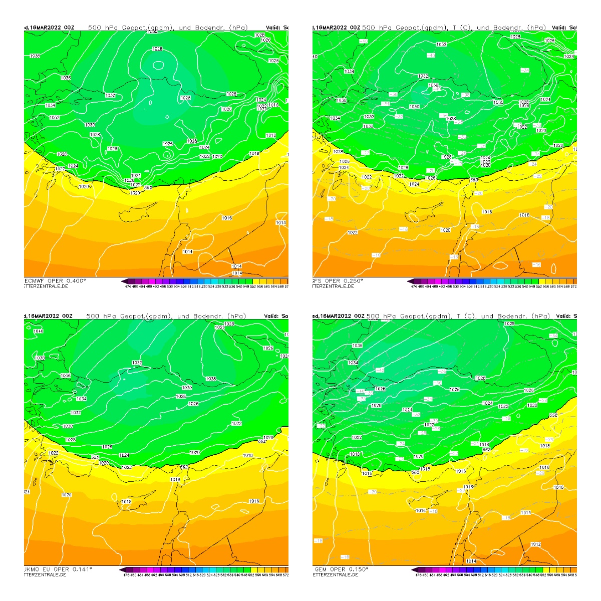 4 Büyük Modelin 16 Mart – 12z Çıktıları: Saat yönünde ECM, GFS, GEM, UKMO. Cumartesi Öğle Saatleri için.