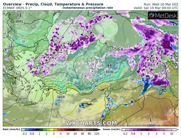 ECM 16Mart 00z: Salı gecesine (22 Mart) Beklenen Toplam Kar Yağışı Miktarı – Sulu Kar Dahil