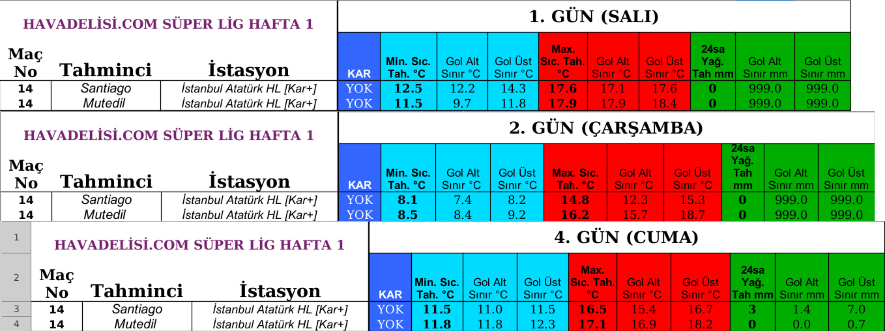 * Yukarıdaki tüm ölçütler eşitse, her iki tahmincinin istasyonu için de sadece 1. günün tahmini tekrar yapılır (tüm değişkenler). Bu penaltı maçında, yine yukarıdaki ölçütlergeçerlidir.