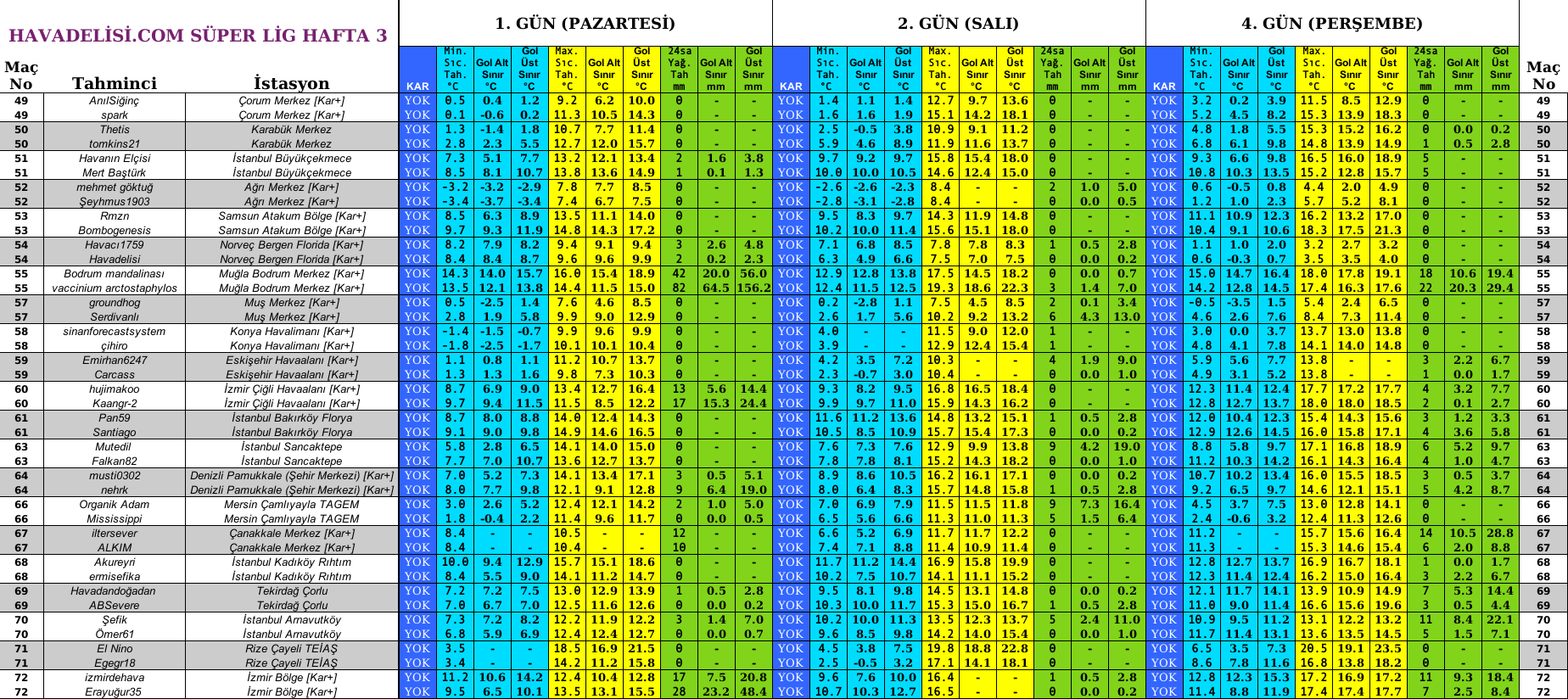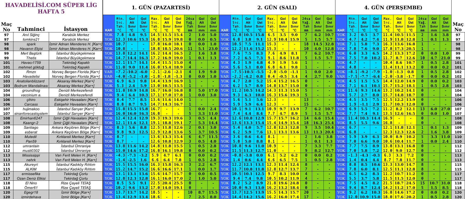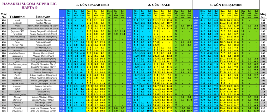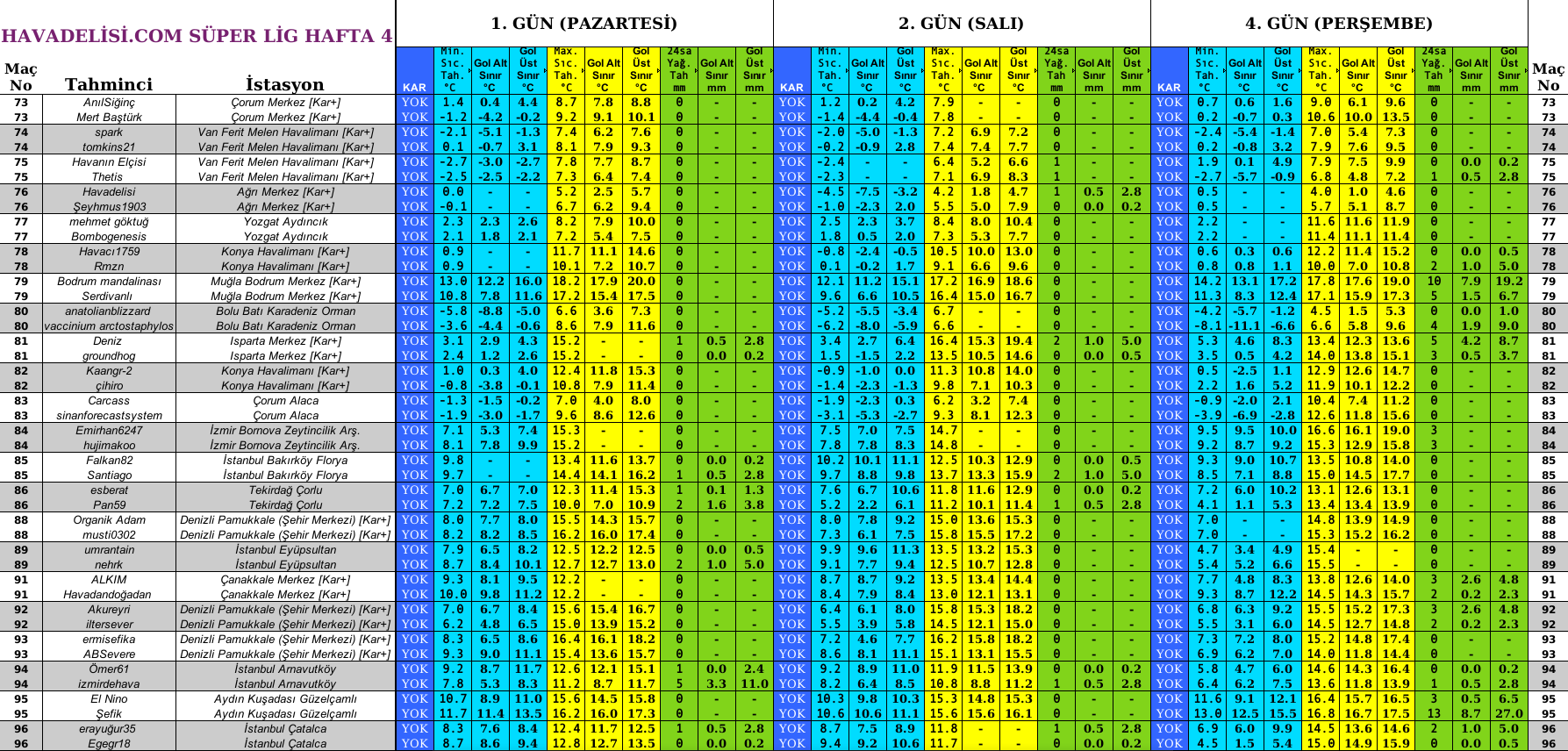 • Söz konusu haftanın maçını iç sahada yapıyorsanız kendi istasyonunuz için, deplasmanda iseniz rakibinizin istasyonu için, her pazar akşamı saat 24’e kadar; pazartesi (1. gün), salı (2. gün) ve perşembe (4. gün) günlerinin her birinin ayrı ayrı minimum sıcaklık, maksimum sıcaklık, toplam yağış ve kar var/yok durumlarını tahmin edeceksiniz. Böylece her maçta (her hafta) 3 gün X 4 değişken = toplam 12 ayrı tahmin yapılmış olacak.