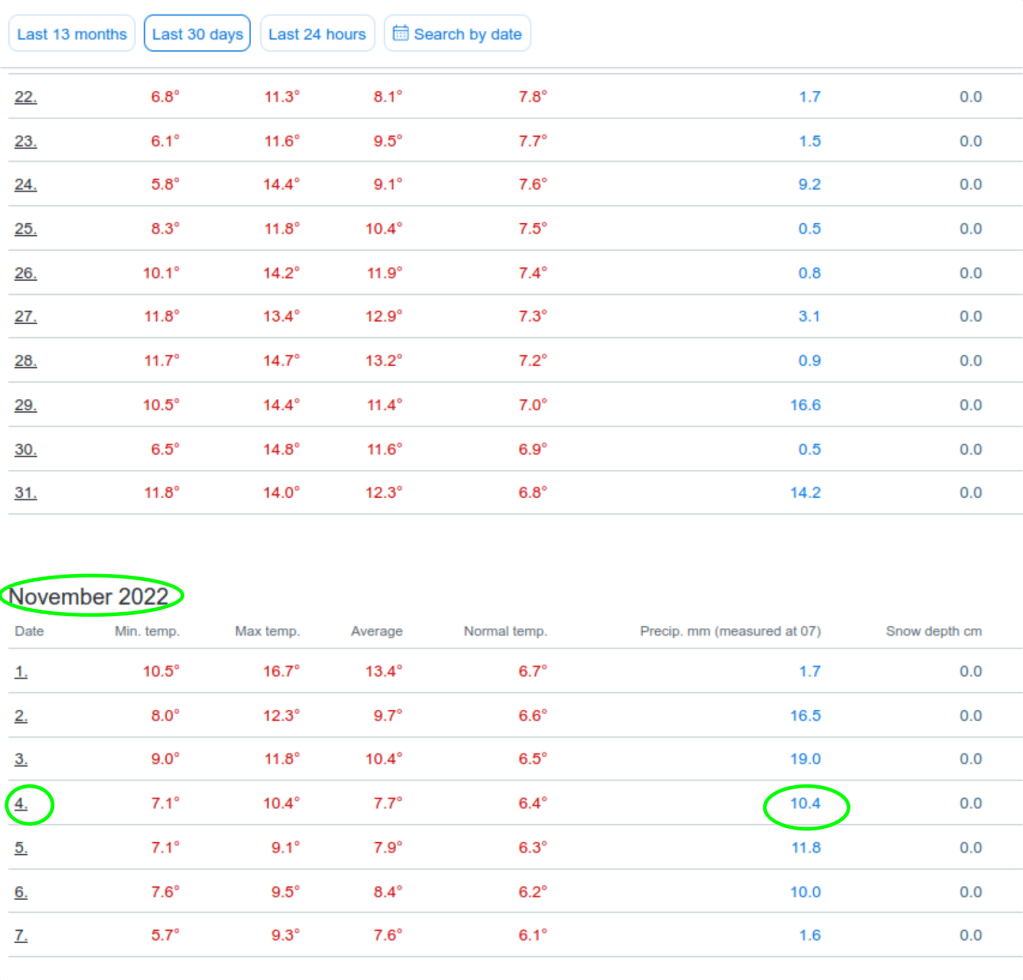 Yukarıda yeşil ile işaretlediğim iki sütundaki tüm değerleri topladığımızda bulacağımız 10,4 mm, bize istediğimiz veriyi sağlıyor. Bu değeri aynı sayfada “Last 30 days”i seçip, oradan 4 Kasım’ı bulup teyit etmeniz mümkün. Dikkat: 4 Kasım’da gösterilen değer, 3 Kasım 08’den 4 Kasım 08’e kadar olan toplam yağış, yani bizim aradığımız değer.