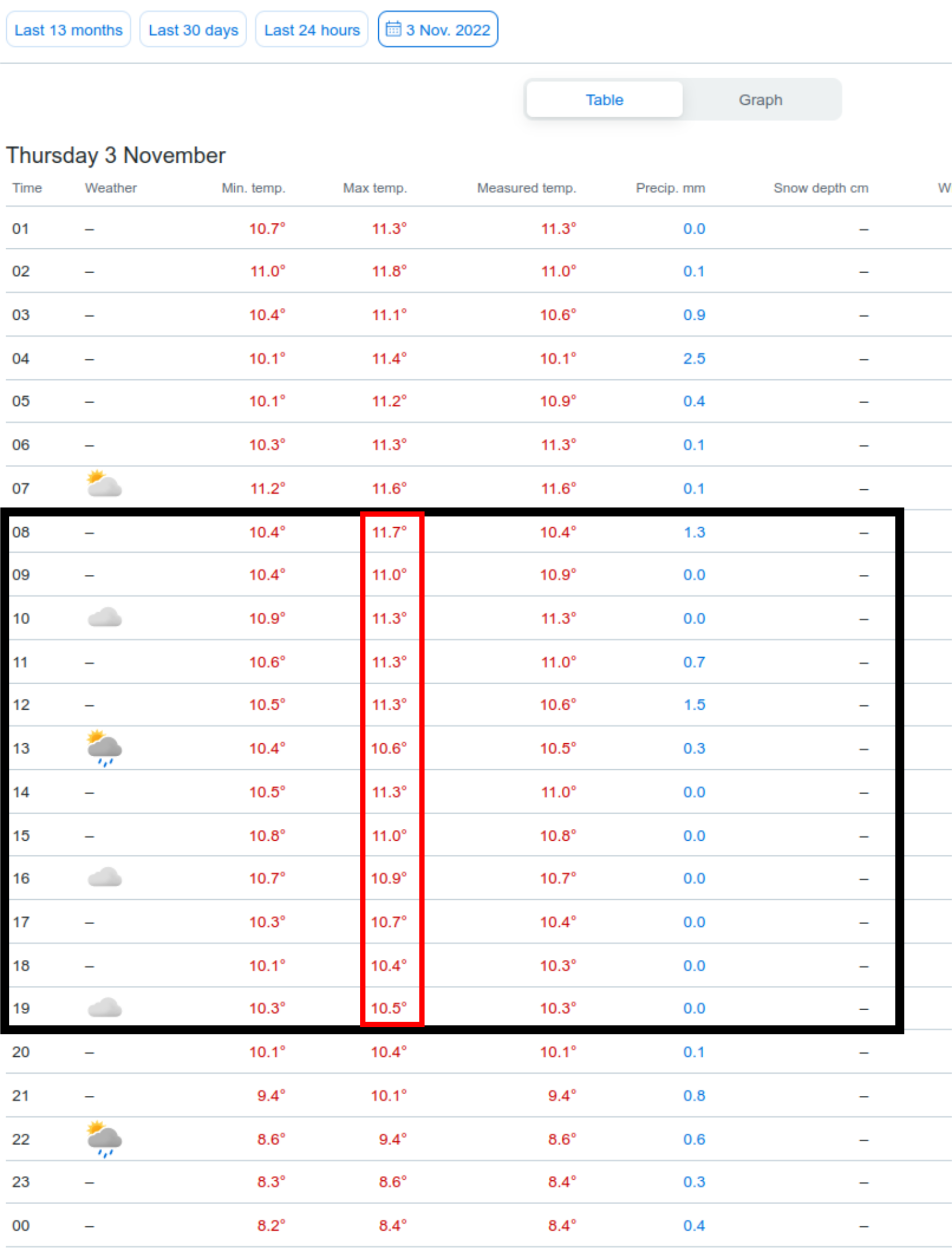 Yukarıda kırmızı ile işaretlediğim sütundaki en yüksek değer 11,7; dolayısıyla 3 Kasım Perşembe için en yüksek sıcaklık parametremiz 11,7 derece oldu. Saat 02 için gösterilen 11,8 dereceyi dikkate almıyoruz (Türkiye istasyonları ile uyumlu olması için).