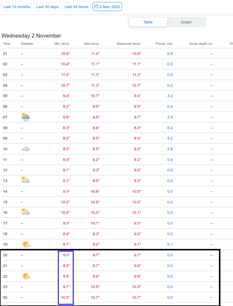 Yukarıda mavi ile işaretlediğim sütunlardaki en düşük değer 9,0; dolayısıyla 3 Kasım Perşembe için en düşük sıcaklık parametremiz 9,0 derece oldu. Dikkat ederseniz bu değer 2 Kasım akşamı saat 19-20 arasında ölçülmüş.