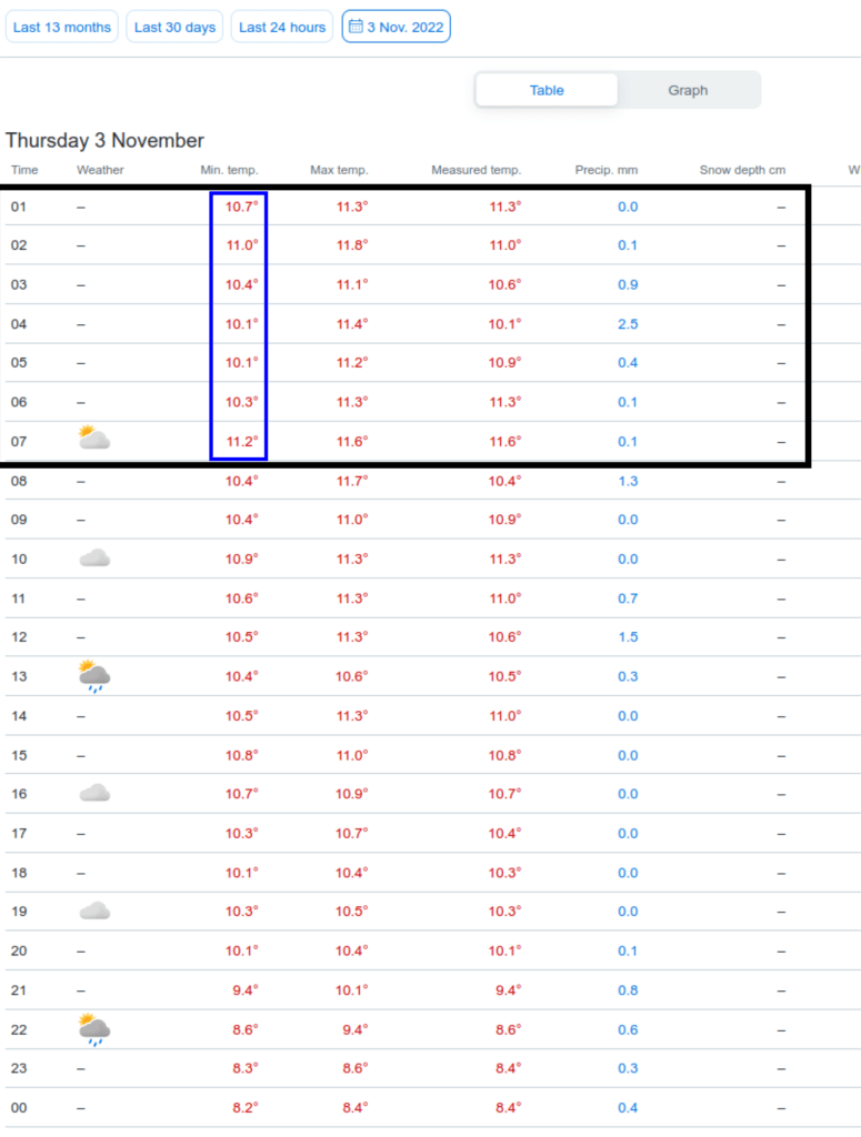 • En düşük sıcaklık: Bu parametre, önceki gün saat 18 UTC ile tahmini yapılan gün saat 06 UTC arasında ölçülen en düşük sıcaklıktır. Dolayısıyla biz Bergen saati ile (UTC+1) önceki gün 19’dan tahmini yaptığımız gün saat 07 arasına bakacağız. Tabloda bu değerleri bize önceki gün saat 20’den (çünkü bu satırda saat 19-20 arası değerler var) tahmini yapılan gün saat 07’ye kadar olan kısım verir. Dolayısıyla öncelikle, bir önceki günü (örneğimizde 2 Kasım) seçiyoruz. Sonra da tahminini yaptığımız güne, yani 3 Kasım’a bakıyoruz. Saat 20 ile 07 arasındaki değerler içindeki en düşük “Min. temp.” değeri bize istediğimiz veriyi sağlıyor.