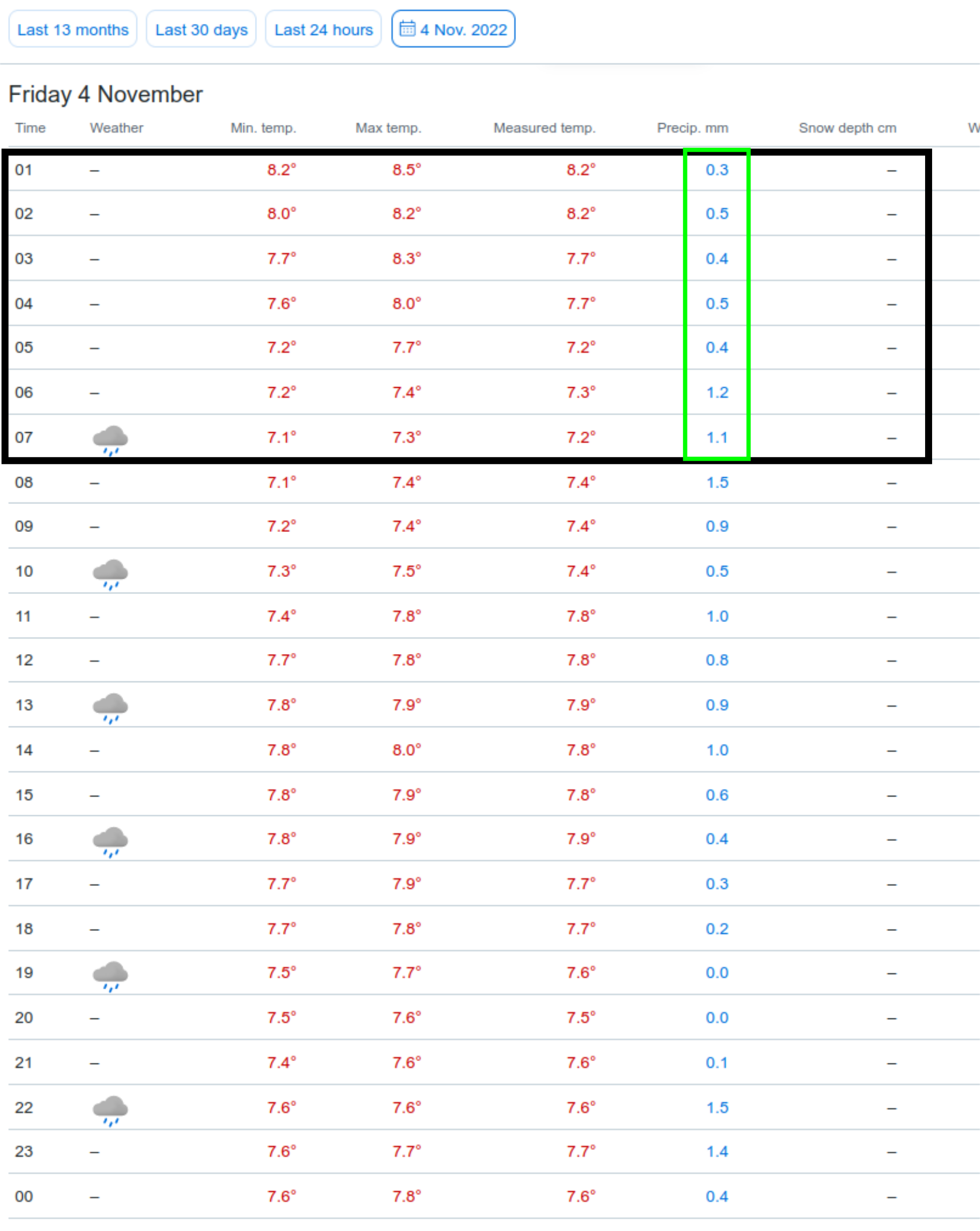 • 24 saatlik toplam yağış: Bu parametre, , tahmini yapılan gün saat 06 UTC ile tahmini yapılan günden bir sonraki gün saat 06 UTC arasında ölçülen toplam yağıştır. Dolayısıyla biz Bergen saati ile (UTC+1) tahmini yapılan gün 07 ile bir sonraki gün 07 arasına bakacağız. Tabloda bu değerleri bize tahmini yapılan gün saat 08’den (çünkü bu satırda saat 07-08 arası değerler var) ertesi gün saat 07’ye kadar olan kısım verir. Saat 08 ile ertesi gün saat 07 arasındaki yağış değerlerinin toplamı bize istediğimiz veriyi sağlar.