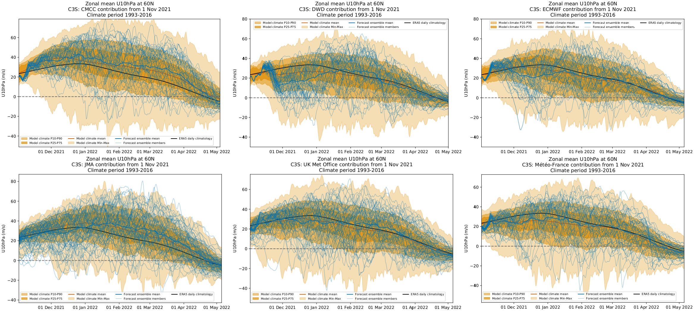 Troposferdeki batı-doğu doğrultulu rüzgarların (zonal wind) eğilimi için tahmin yapan altı kurumun Aralık ayı tahminleri aşağıdaki görselde birleştirilmiş olarak mevcut.