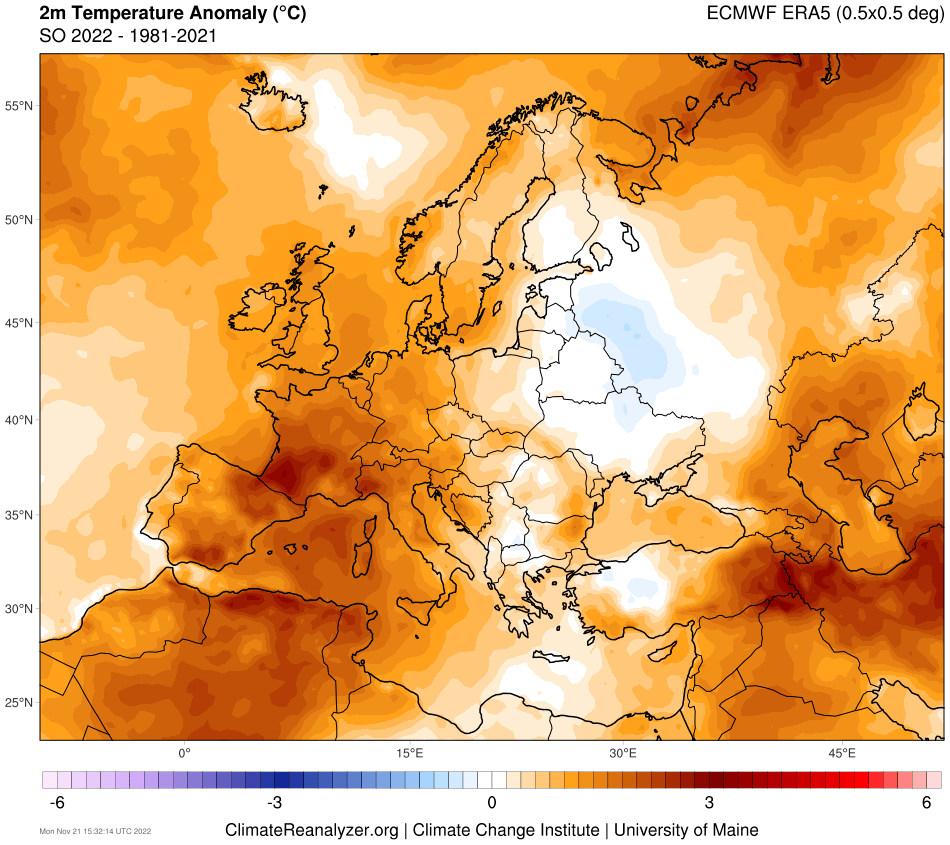 Kuraklığın aksine, batıda Eylül ve Ekim ayı ortalama sıcaklıklarının normallerin ancak biraz üzerinde olduğunu, doğuda ise 2-3 derece üzerine çıktığını görüyoruz. Ancak Kasım ayının bol lodoslu ve normallerden çok sıcak geçmesi 2022 sonbaharının hem ılık hem de oldukça kurak kapanmasına yol açacak.