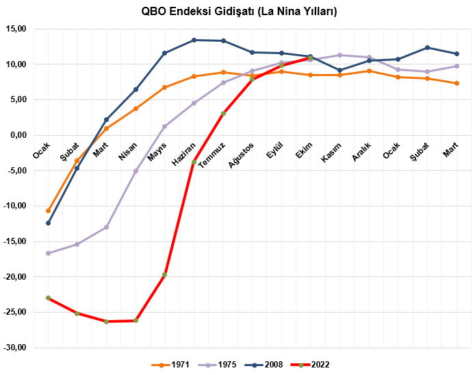 QBO endeksinin bu seneki gidişatına en fazla benzeyen üç tane kış var. 1971-1972, 1975-1976 ve 2008-2009.