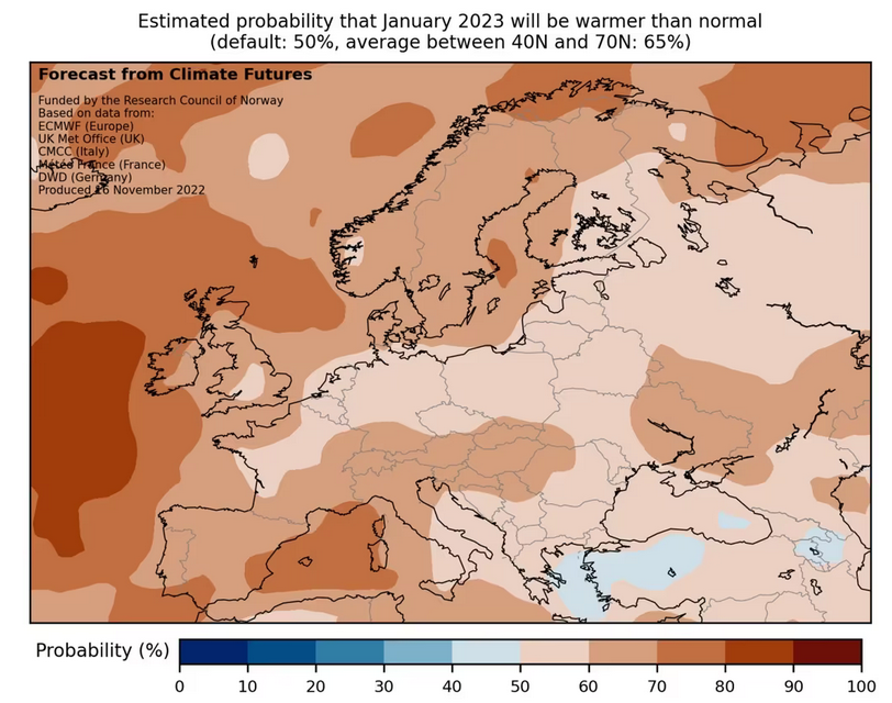 Birçok kurumun model çıktılarını kendi yöntemleri ile harmanlayarak mevsimlik tahmin üreten Norveç Bergenli Climate Futures ekibi de bu kış Avrupa’da normalden ılık olma ihtimalinin en az olduğu yeri Türkiye (özellikle batısı) olarak veriyor. Aşağıda Ocak ayı için yayımladıkları tahmin var.