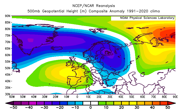 Batı Avrupa’da bir yüksek basınç merkezi, İskandinavya üzerinden kıtaya sürekli dalan İzlanda kökenli siklonlar alçak ve Rusya’nın kuzeyinde bir yüksek basınç merkezi… Güzel bir pozitif NAO endeksi…