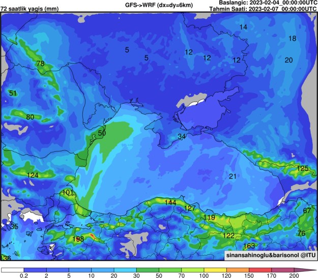 4 Şubat 2023 GFS 00Z çıktısına göre WRF modeli 72 saatlik toplam yağış haritası