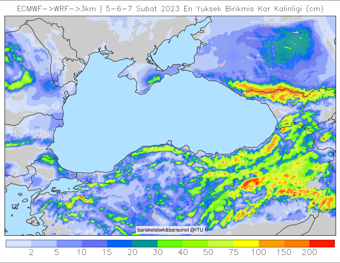 WRF modeli 4-5-6 Şubat 2023 En Yüksek Birikmiş Kar Kalınlığı, görsel İTÜ Meteoroloji Mühendisiği bölümünden Barış Kelebek ve Barış Önol Hoca’dan