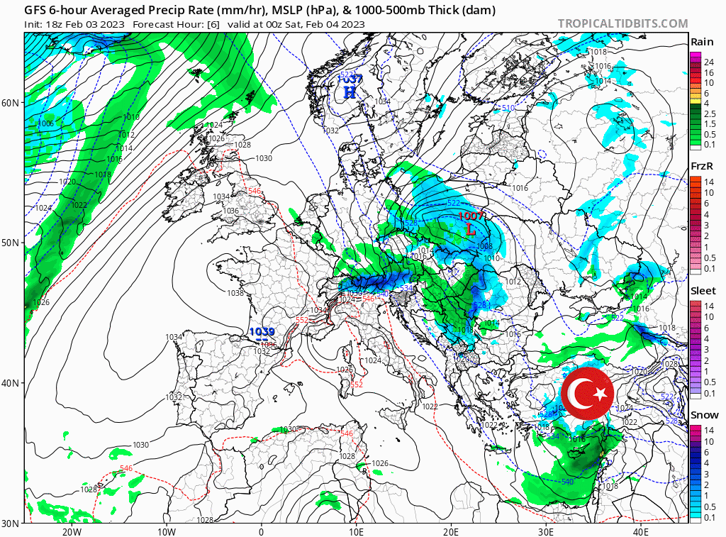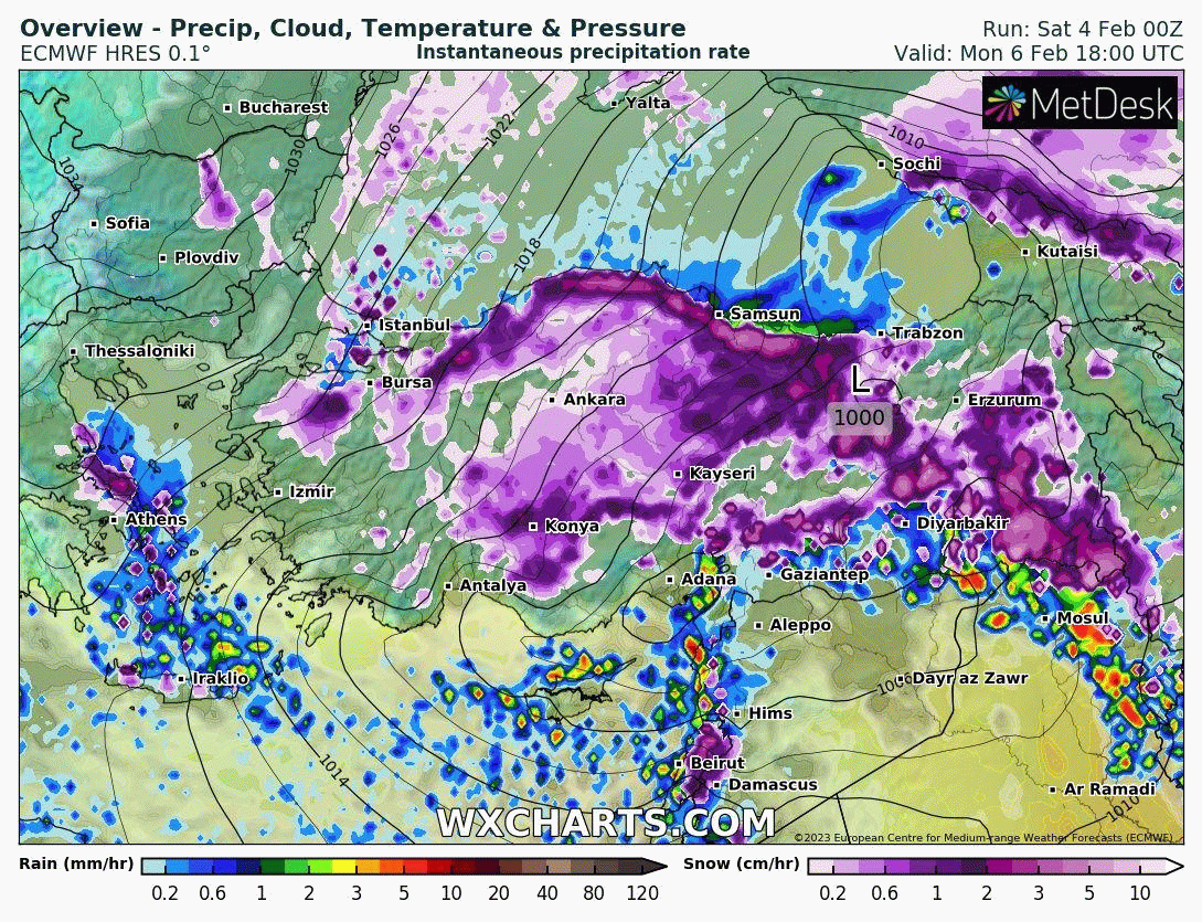 4-5 Şubat 2023 Yağış, kalınlık ve deniz seviyesine indirgenmiş basınç animasyonu