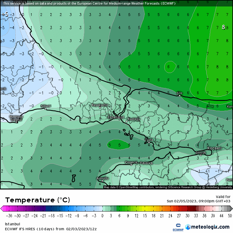 Pazar gece yarısından itibaren ise alçak basıncın yaklaşmasıyla birlikte 850 hPa soğuğu batıya itilecek ve rüzgar karayelden yıldıza dönecek, bu geçiş esnasında hava sıcaklığının İstanbul’un batısı (Silivri ve Çatalca) hariç hızlıca artmasını, ve hatta şehrin büyük bölümünde yağışın formunun karla karışık yağmur ve yağmura dönmesini bekliyoruz. Başakşehir, Beylikdüzü vb. yüksek rakımlı ilçelerde kar yağışı devam edebilir fakat bir yandan da şıp şıp seslerinin duyulması muhtemeldir. Maalesef bu sistemde soğuk şiddetli değil, ayrıca Karadeniz deniz suyu sıcaklıkları da 1982’den bu yana bu mevsimdeki en ılık durumunda. Dolayısıyla yağmura ve sulu kara dönüş kaçınılmaz.