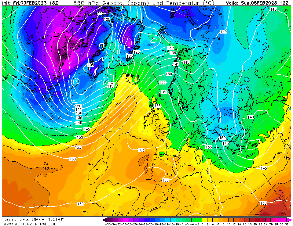 5 Şubat 2023 12Z 850 hPa jeopotansiyel yüksekliği ve sıcaklığı