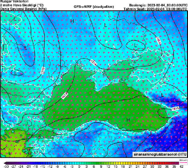 WRF modeli rüzgar, sıcaklık ve deniz seviyesi basıncı
