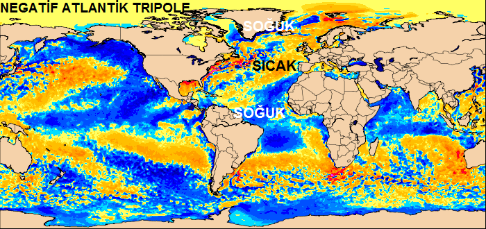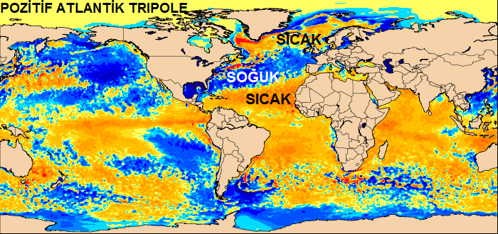 Eski mevsimlik tahminlerimizde yararlandığımız başka bir veri de buydu. Atlantik Okyanusu su sıcaklıkları dağılımını incelediğimizde, orta enlemlerde (ABD güney doğusundan İngiltere civarlarına kadar) normalden serin sular, Grönland ve Arktik civarında ise normalden sıcak sular görülüyorsa bu durum “Positive Atlantic Tripole” ya da Türkçeleştirirsek Pozitif Atlantik Üçkutbu olarak nitelendiriliyor. Bunun tersi olduğunda ise Negatif Atlantik Üçkutbu deniliyor. Aşağıdaki haritalarda ne demek istediğimizi görebilirsiniz.