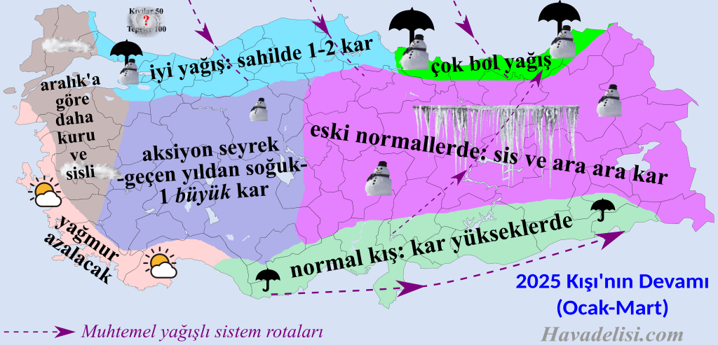 - Yağış getirecek hava sistemlerinin Ocak-Mart aylarında genellikle Karadeniz ve Doğu Akdeniz kökenli olacağını, dolayısıyla yağmur ve kar bakımından en şanslı bölgelerin Karadeniz ve ülkenin doğu yarısı ile İstanbul ve Doğu Marmara olacağını tahmin ediyoruz. Güneydoğu Anadolu’daki il merkezleri de bu kış kar bakımından şanslı saydığımız yerler arasında (Doğu Anadolu’dan farkını belirtmek için haritada farklı renge boyadık).