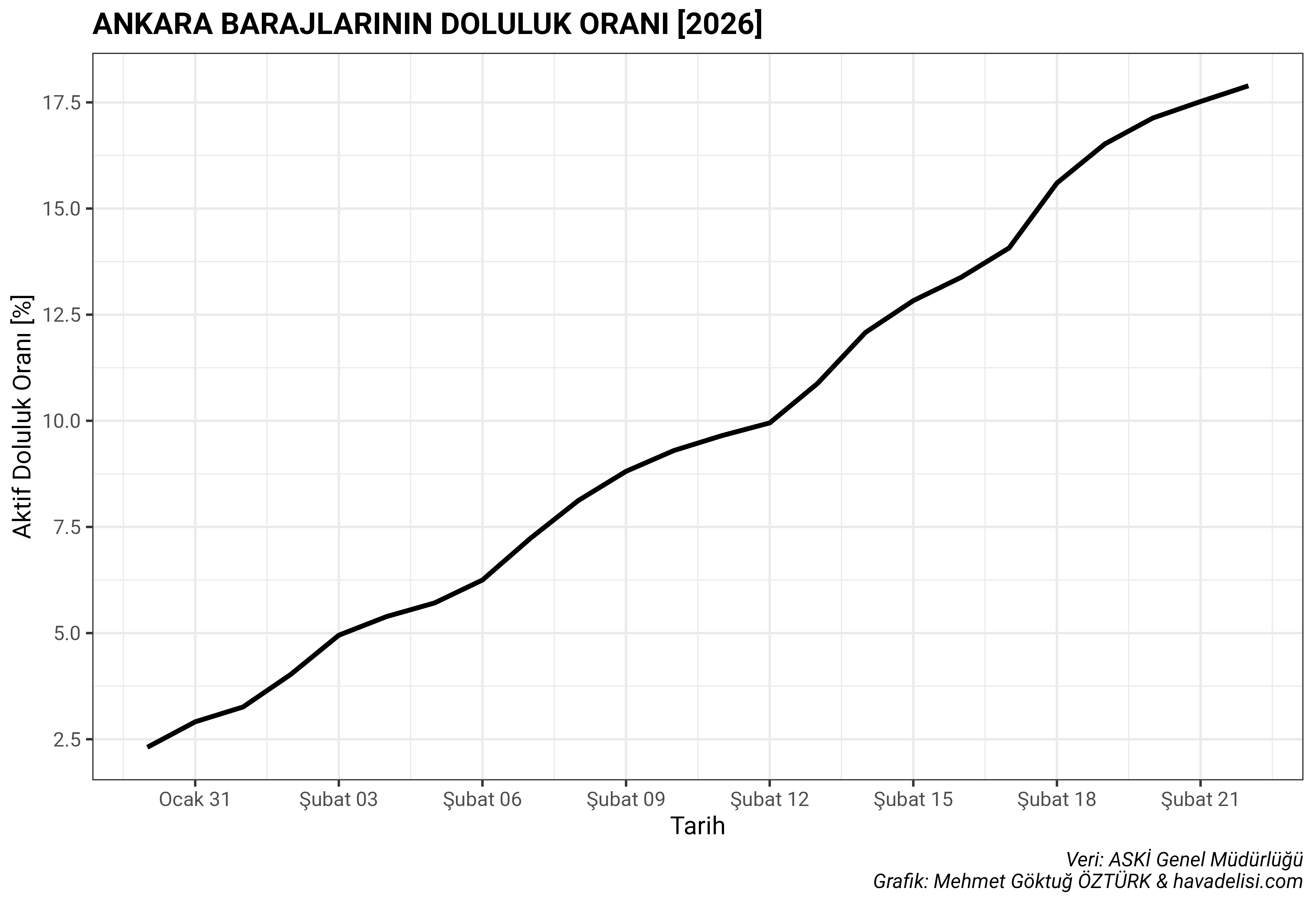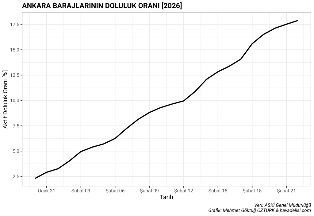 Bu sene bolca konuştuğumuz barajlara bakacak olursak, son birkaç yıdır süregelen kuraklık sonrasında Ankara ve İzmir Barajları’nda su, neredeyse bitme noktasına gelmiş, su kesintileri dolayısıyla milyonlarca insan mağdur olmuştu. Ocak ve şubat ayındaki yağışlarla beraber Ankara ve İzmir barajlarında büyük miktarda artışlar meydana geldi. Aşağıdaki grafiklerde bunu net olarak görebilirsiniz.