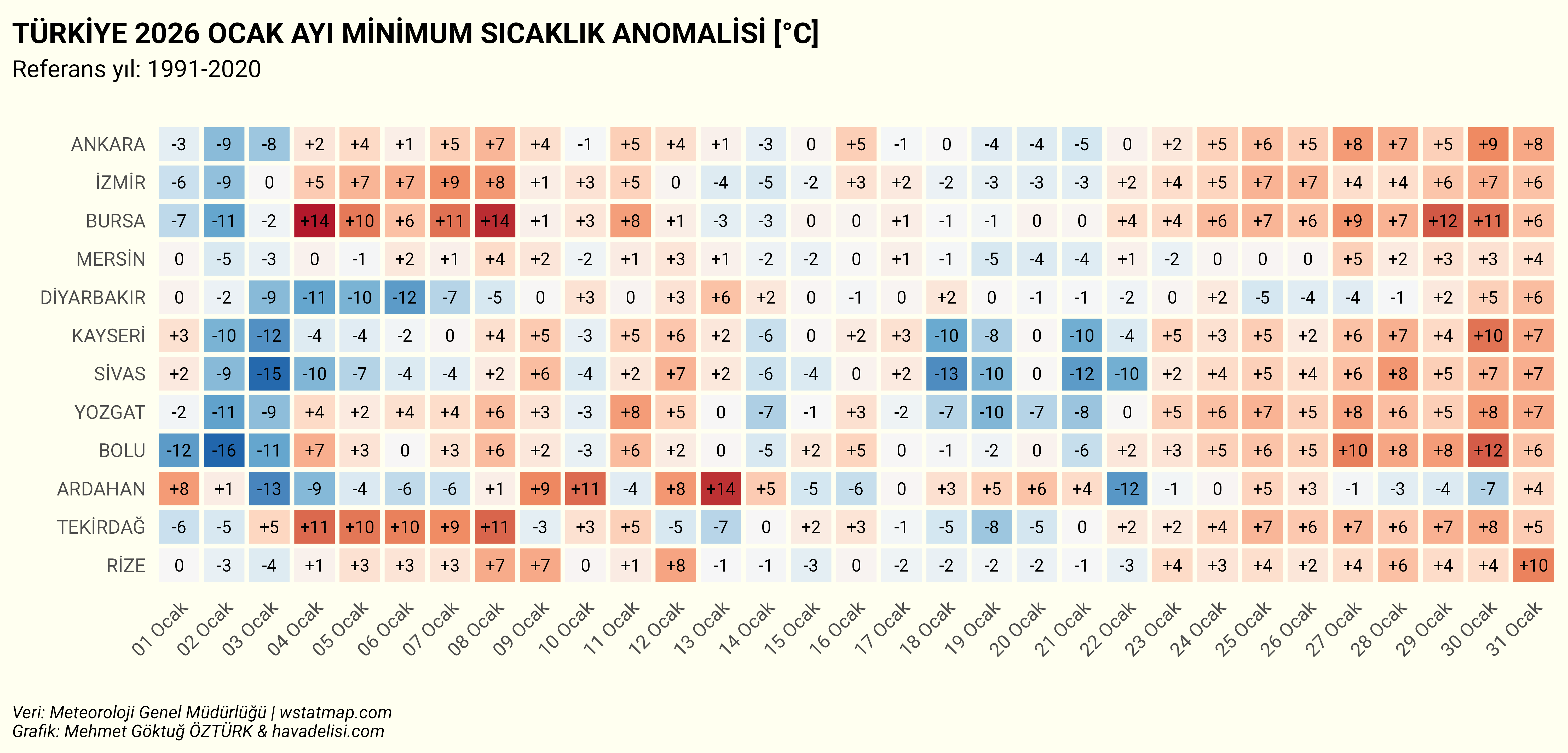 Şimdi de ülke genelini ve hava delilerini az çok temsil eden 12 istasyonun minimum sıcaklık anomalisini ısı haritasıyla inceleyelim. Anomali, her bir istasyonda ölçülen minimum sıcaklıkların, 1991-2020 minimum sıcaklık ortalamasından çıkartılmasıyla oluşturulmuştur. İstanbul’u, MGM sitesinde olmadığı için ne yazık ki ekleyemedim. Tekirdağ ve Bursa fikir verebilir.