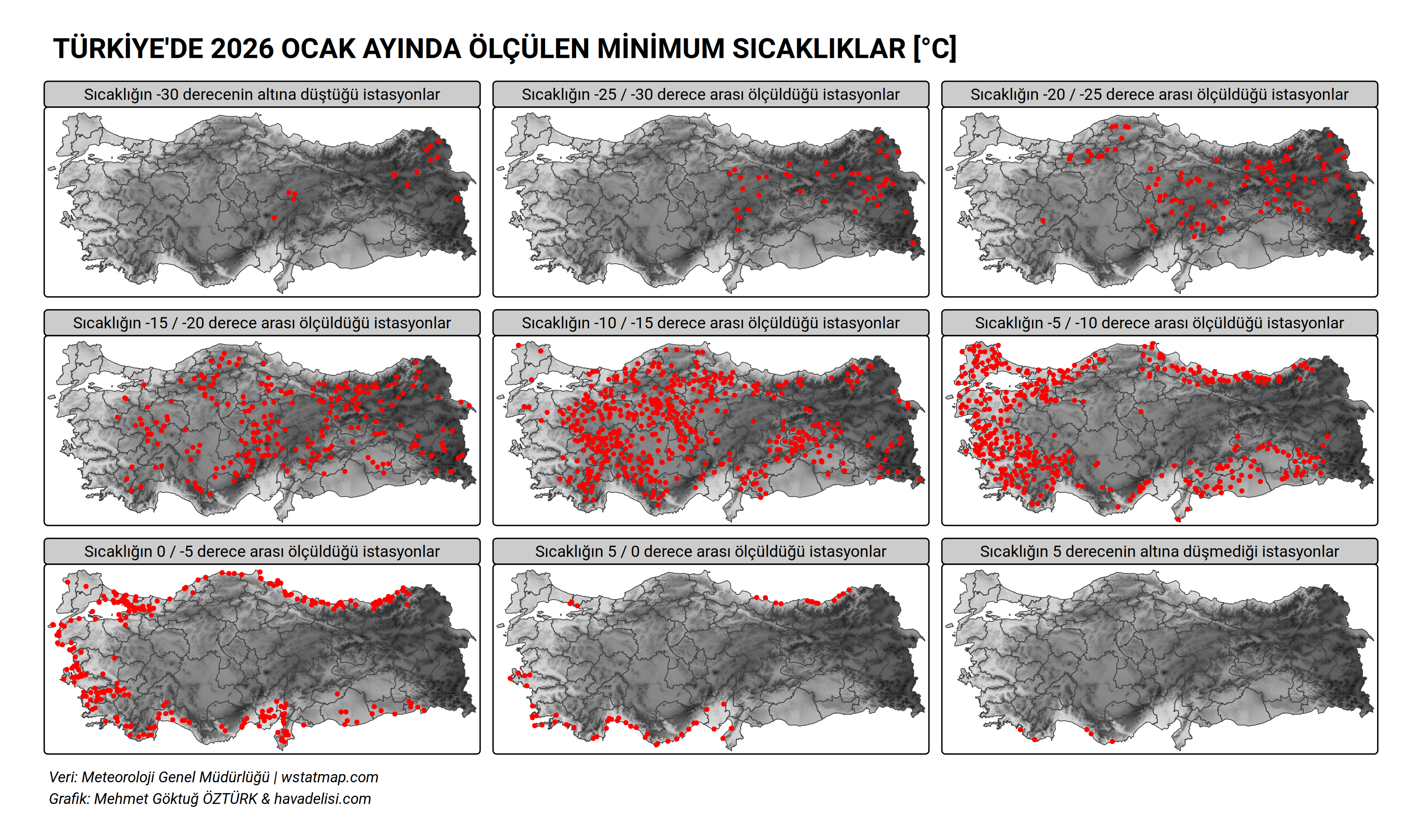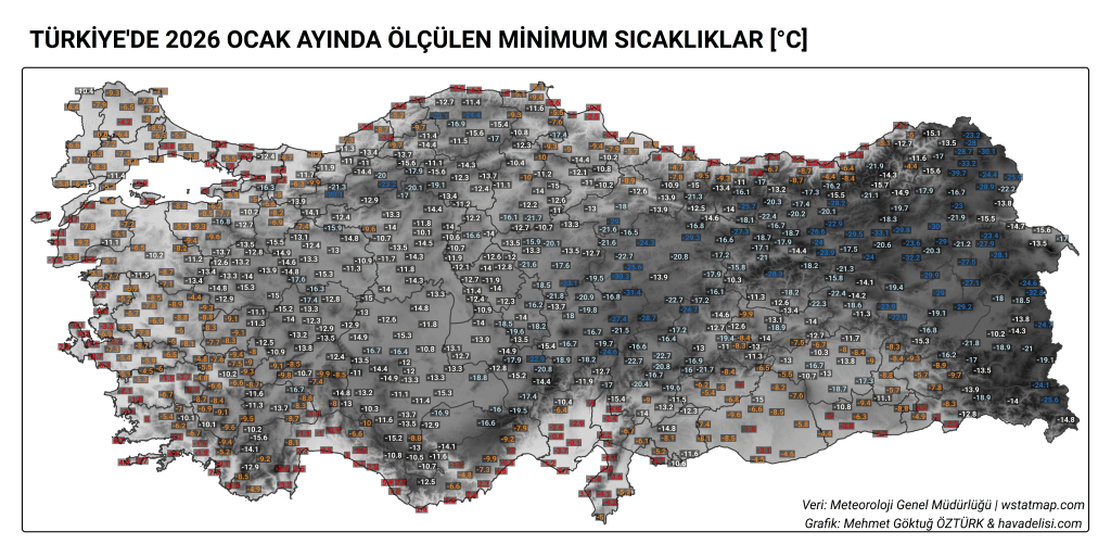 Her bir istasyonda ölçülen en düşük sıcaklığın değerine bakacak olursak, ocak ayının en düşük sıcaklığı, 3 Ocak tarihinde Ardahan Göle’de -39,7 °C ile ölçülmüş. En düşük sıcaklığın en yüksek olduğu istasyon ise 7.5 °C ile Muğla FETHİYE/İBLİSBURNU DÖKÜNTÜTAŞ FENERİ olmuş.