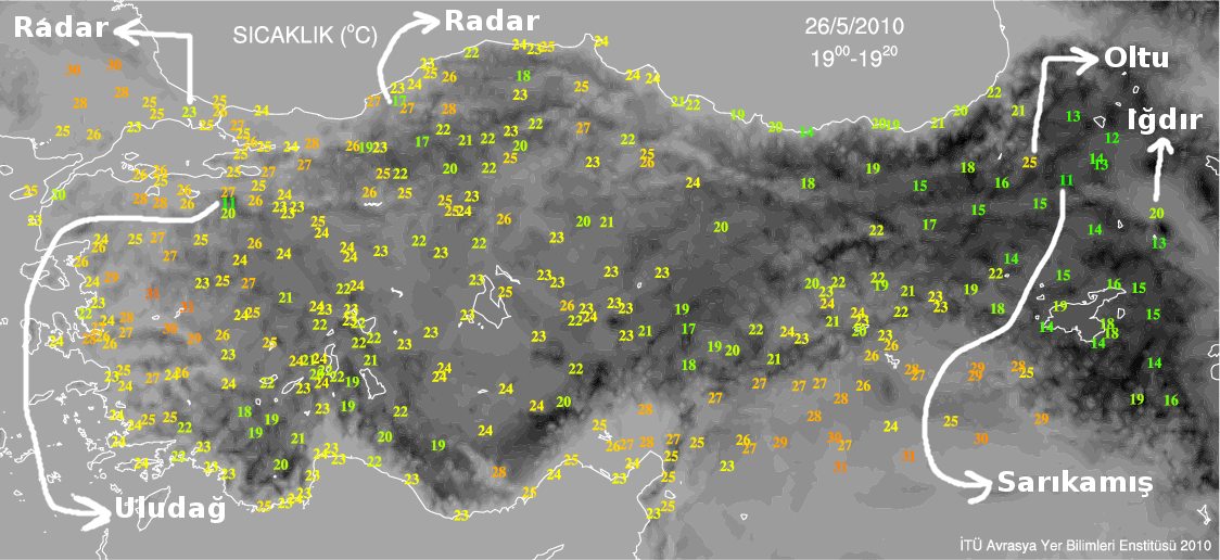 DMİ’nin otomatik istasyon ağı özellikle 2010’un ilk aylarında çok genişledi. Doğu ve Güneydoğu Anadolu’daki istasyonların çoğu yeni. Başkale, Sarıkamış gibi yerlerden veri geliyor ki bunları takip etmek çok ilginç olacak. Yazın da Mut vadisinin feci sıcak olduğu söylenirdi, bunu da gözlemleme şansı bulduk. Öte yandan bazı istasyonların kalibrasyonunun iyi yapılmadığı anlaşılıyor, buralardan yanlış veri geliyor, zaman zaman tespit edebildiklerimi listeden çıkarıyorum. Bazen de, şurada ve şurada anlattığım gibi durup dururken garip değerler görünüyor, onlara yapacak çok fazla bir şey yok, DMİ işte deyip geçeceğiz. Ayrıca, radara monte edilmiş istasyonlardan, Uludağ’dan, Sarıkamış’tan (ilçe merkezi), çevrelerine göre gayet düşük değerler, Oltu ve Iğdır gibi mikroklima özelliği gösteren yerlerden de yüksek değerler gelebilir, haritaya bakarken aklınızda olsun. Bununla ilgili ayrı bir yazı da yazmıştım, burada.