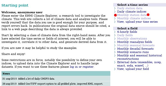 Sağ sütunda iki ana seçenek var. Bunlardan ilki bir zaman serisi (time series) seçmenize, ikincisi de bir alan (field), yani tek bir nokta değil de birden çok noktayı kapsayan bir veri seti seçmenize olanak tanıyor. Dünya kadar güncel ve tarihsel veriye ulaşmanız mümkün. Mesela Monthly station data seçeneğinden, GHCN tarafından bir araya getirilmiş dünyadaki yaklaşık 7000 istasyonun bir çoğunun aylık tarihsel sıcaklık ve yağış verisini görüntüleyebilirsiniz. Onun altındaki Monthly climate indices seçeneği ise sizi ENSO, NAO, AO ve başka birçok iklim indisinin tarihsel değerlerine ulaştırıyor. Ben burada şimdilik, sizin ilginizi en fazla çekeceğini düşündüğüm ve Türkiye’yle ilgili en fazla veriye ulaştıran bölümü nasıl kullanmanız gerektiğini izah edeceğim.