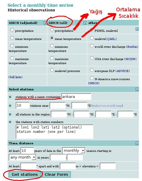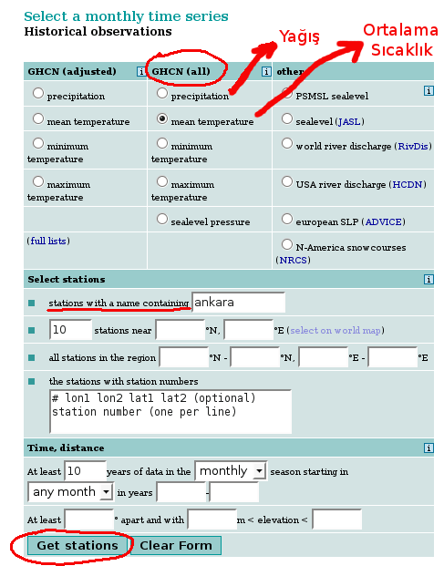 Onun altında istasyonun seçildiği bölüm var. Türkçe karakter kullanmadan, istasyon ismini ya da ismin bir kısmını benim ankara yazdığım yere yazın. Bu en basit yöntem, eğer belli enlem boylam değerleriyle sınırlanan bir alandaki tüm istasyonları görüntülemek istiyorsanız onun iki altındaki all stations in the region kısmına alanınızı sınırlayan enlem boylam değerlerini girin, istasyon ismi kısmını da boş bırakın. Mesela dört kutucuğa sırayla 36, 42, 26, 45 yazarsanız Türkiye’deki bütün istasyonlar gelecektir. Şimdilik bunu yapmıyoruz ve sadece istasyon ismini yazıp Get stations‘a (istasyonları getir) tıklayarak devam ediyoruz.