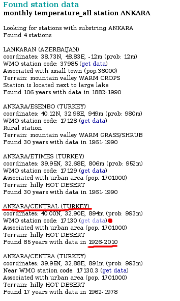 Ve karşımıza içinde ankara geçen ve veri tabanında aylık ortalama sıcaklık değerleri bulunan tüm istasyonlar geliyor. Esenboğa, Etimesgut da gördüğünüz gibi buna dahil. Biz, altını kırmızıyla çizdiğim, verisi en uzun olan istasyonu seçiyoruz, get data‘ya (veriyi getir) tıklıyoruz. Ve karşımıza şu sayfa çıkıyor:
