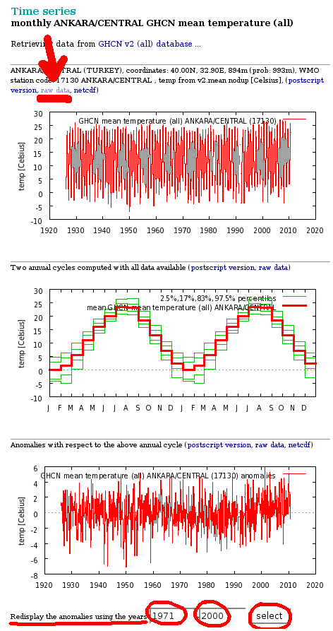 Burada raw data‘ya (ham veri) tıkladığınızda, gördüğünüz grafikleri çizmek için kullanılan ham DMİ ölçümlerine ulaşıyorsunuz (aşağıdaki resim). Yukarıdaki ilk grafikte Ankara’nın uzun yıllar yıllık ortalama sıcaklığı görülüyor. İkincisinde sıcaklığın mevsimsel döngüsü betimlenmiş. Sonuncuda da yıllık ortalama sıcaklığın 1971-2000 periyodunu normal olarak belirlendiğinde yıllar içinde normalden nasıl saptığı gösteriliyor. Altını çizdiğim yere mesela 2000-2009 girerseniz bu sefer normal 2000-2009 olarak belirleniyor ve sapmalar o periyoda göre hesaplanıp grafik de güncelleniyor.