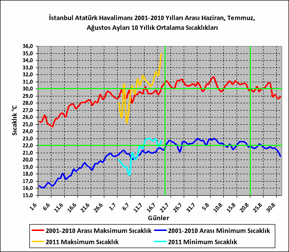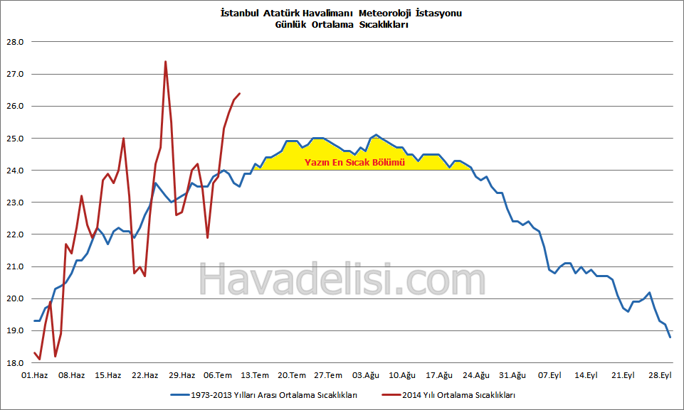 İstanbul Atatürk Havalimanı Meteoroloji istasyonuna ait uzun yıllar ortalama sıcaklıklarını derleyerek elde ettiğimiz verilere göre, istatistiksel olarak yazın en sıcak bölümüne yarın itibariyle giriyoruz. (13 Temmuz – 23 Ağustos).