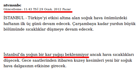 Hafta sonunda hava soğuyacakmış, kar olabilirmiş, dediler. Baktım: Sıradan bir Mart soğuması ve (İstanbul için) belki birkaç saatliğine havada görebileceğiniz, en uç durumda alçak yerlere 3-5 santimetrelik vıcık vıcık bir örtü yapacak lezzetsiz bir kardan başka bir şey göremedim. İlginç ya da önemli bir hava olayı yaşanmayacaksa, zamanım da çok olmadığı için hava tahmini yapmıyorum, ama bu gelen soğuma ve muhtemel kar yağışına enteresan bir ilgi var, ondan dolayı birkaç şey söylemek istedim.